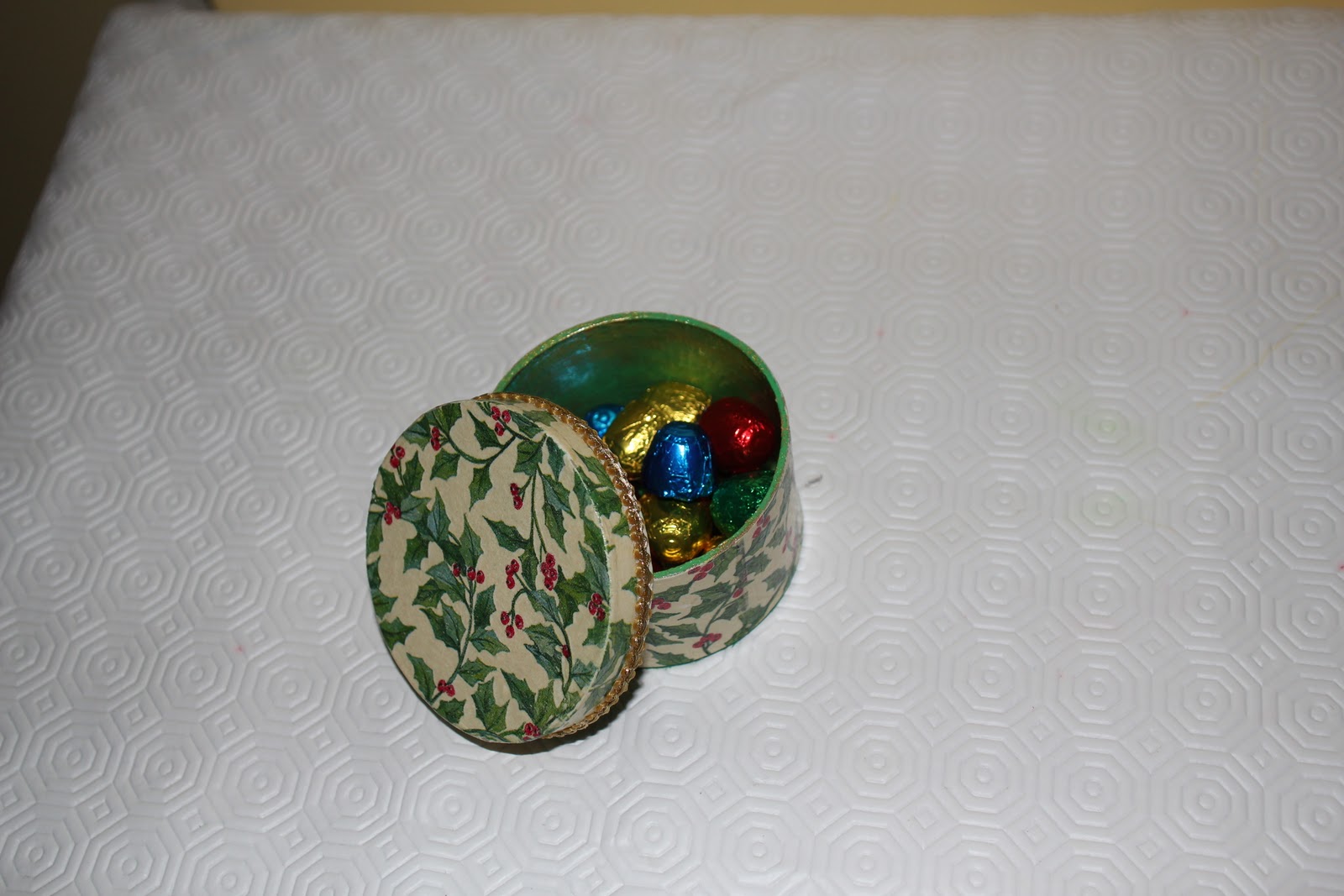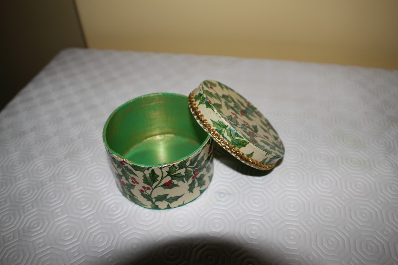 | Caixa de cartão, técnica do guardanapo , pintura e aplicação de fita dourada |