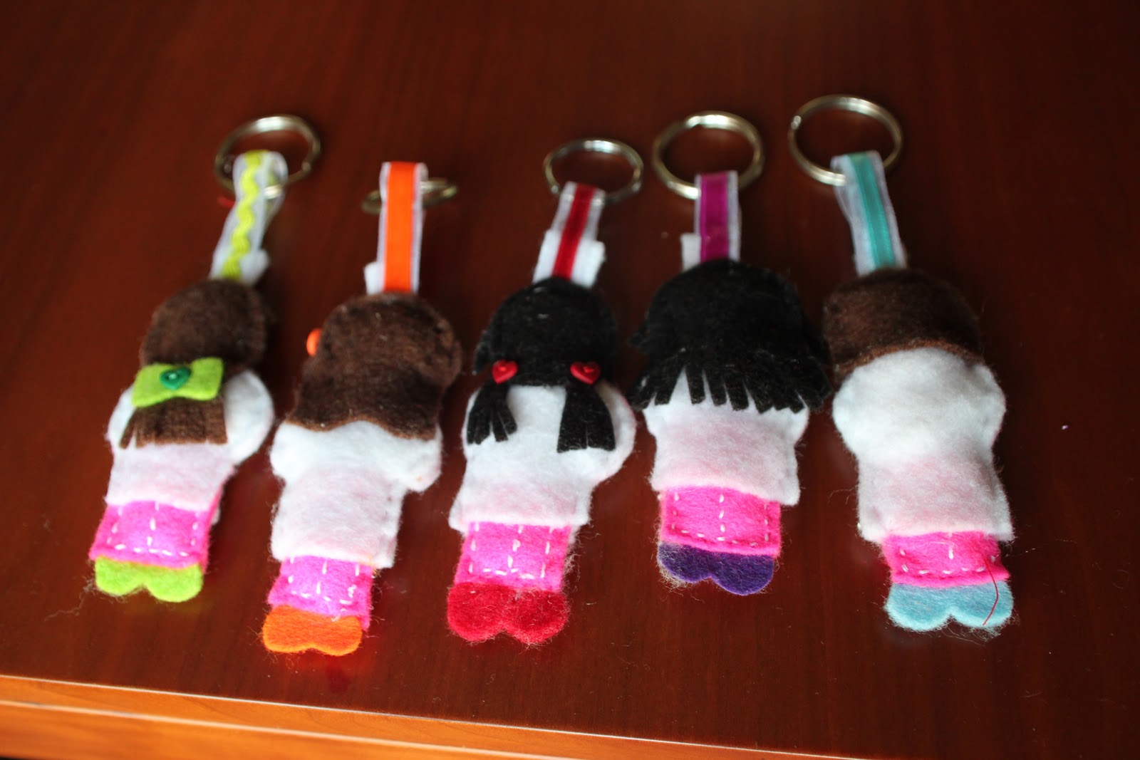 Porta-chaves em feltro com aplicação de fitas várias e botõezinhos coloridos