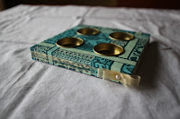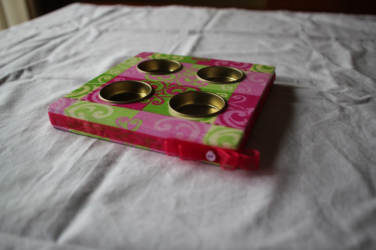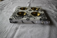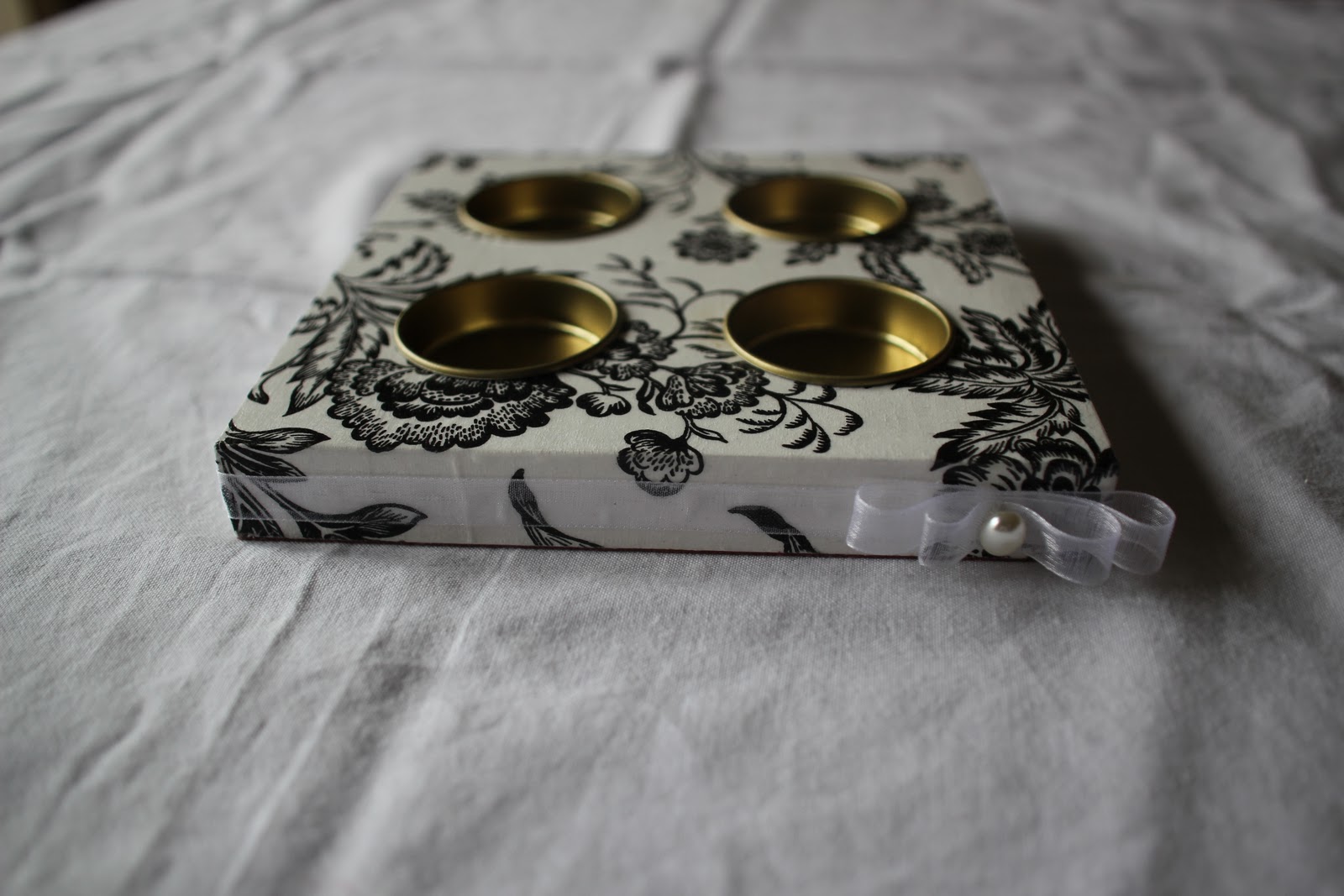 | Suporte em madeira para 4 tea lights - guardanapo e fita de organza |