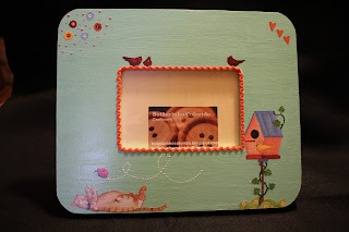 | Moldura em madeira, pintura, decoupage, aplicação de grega e "salpicos" de relevo |