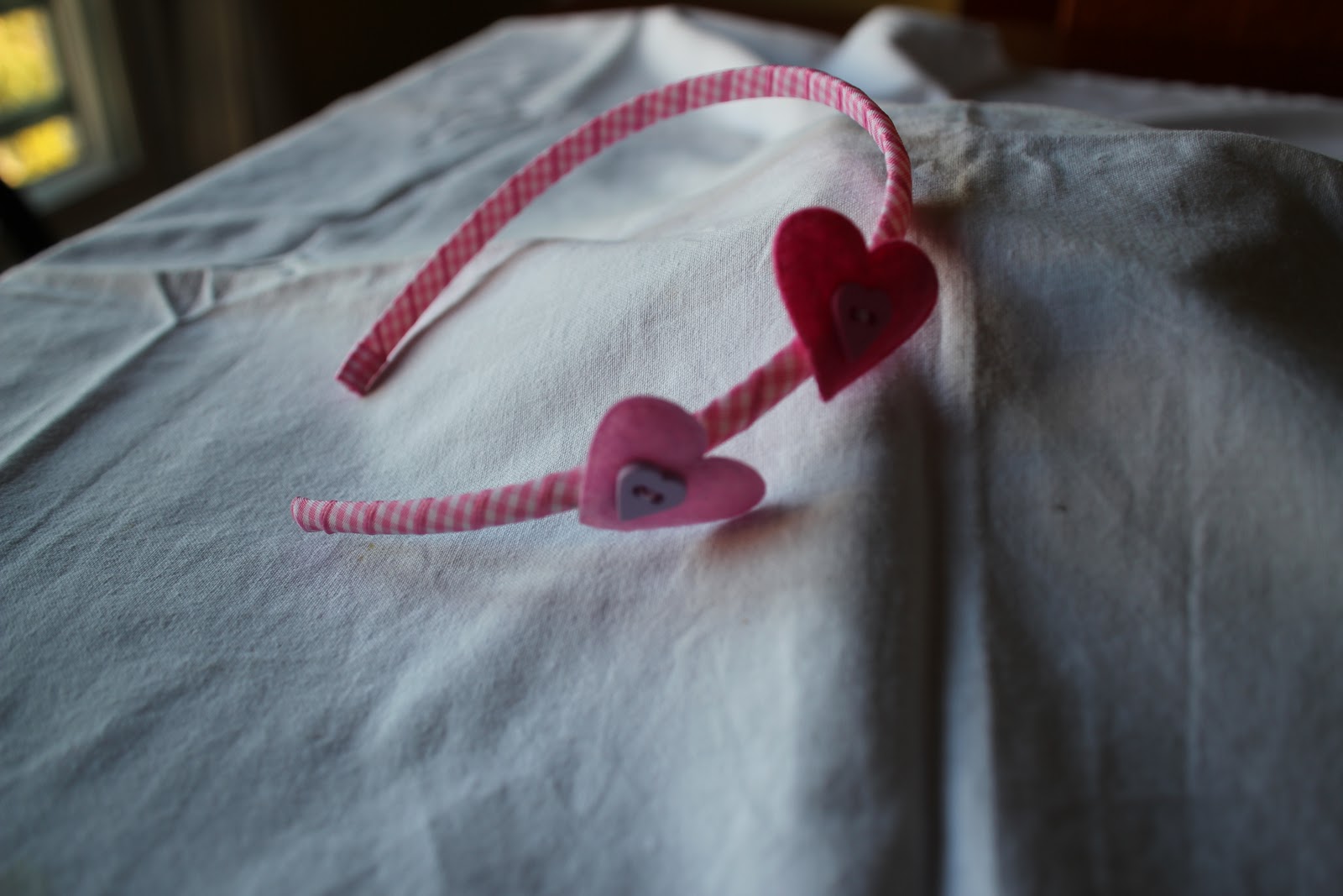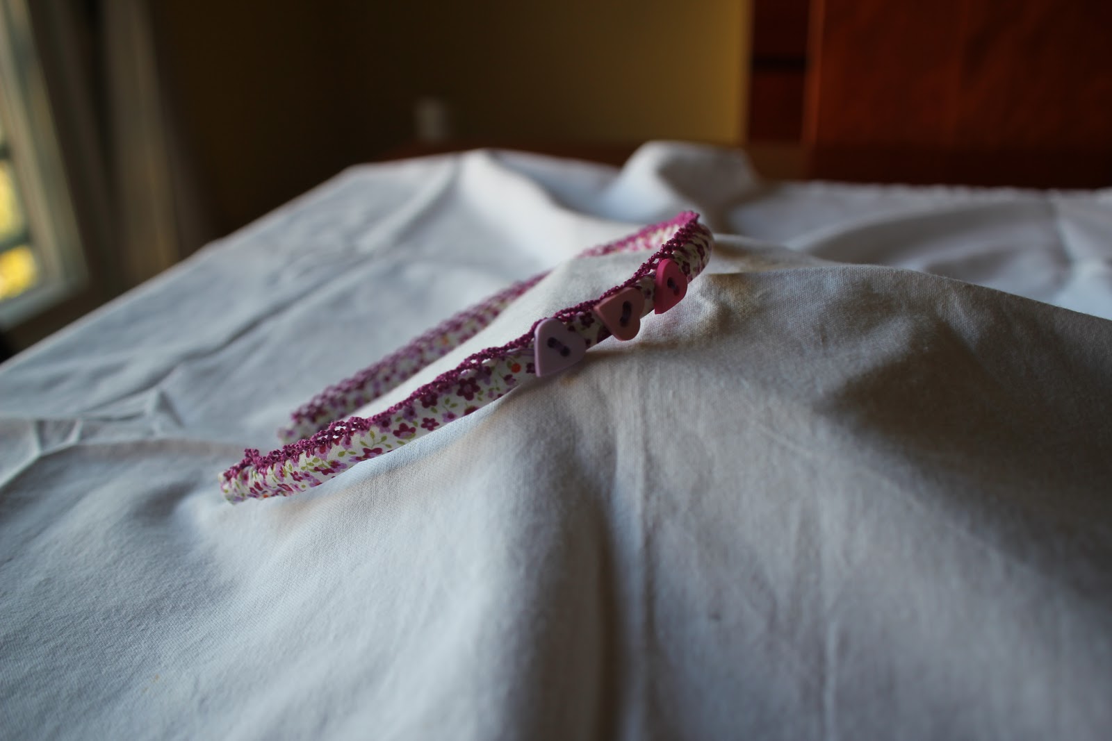 | Bandolete forrada com fita e aplicação de corações em feltro e botões |