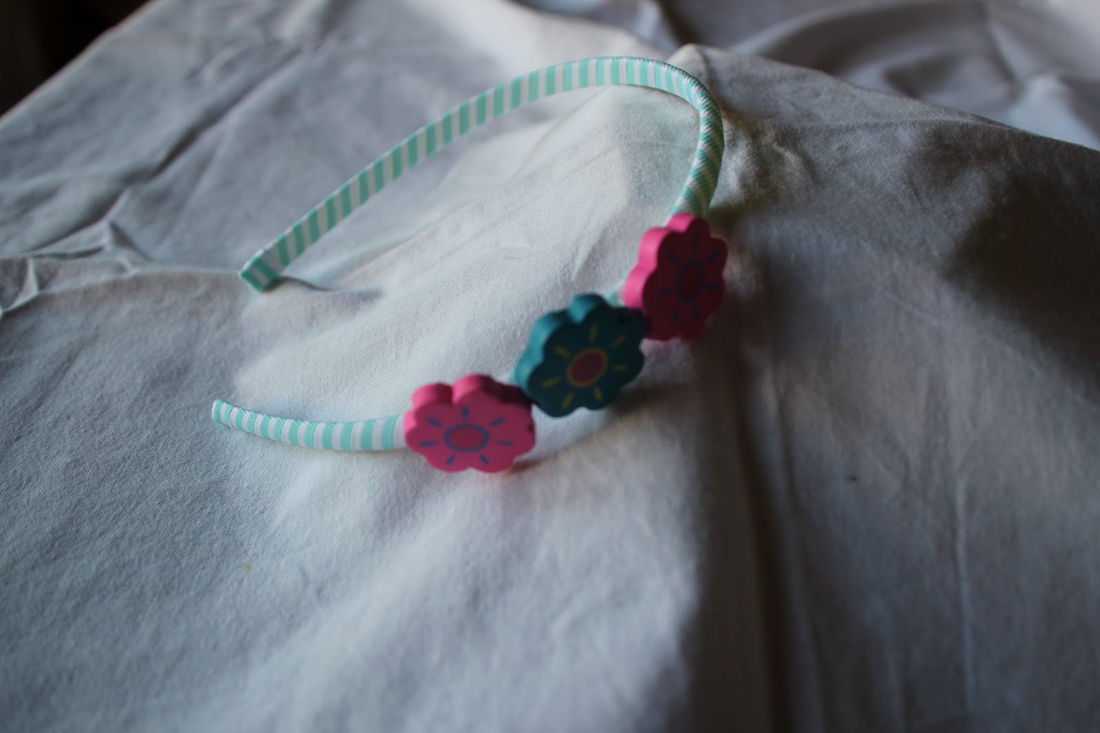 | Bandolete forrada com fita e aplicação de flores de madeira colorida |