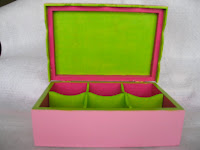 O trabalhinho que vos trago hoje era para ser mais uma caixa de chá, mas resolvi dar-lhe outra vida! Assim ficou transformada em caixinha de bijuterias.